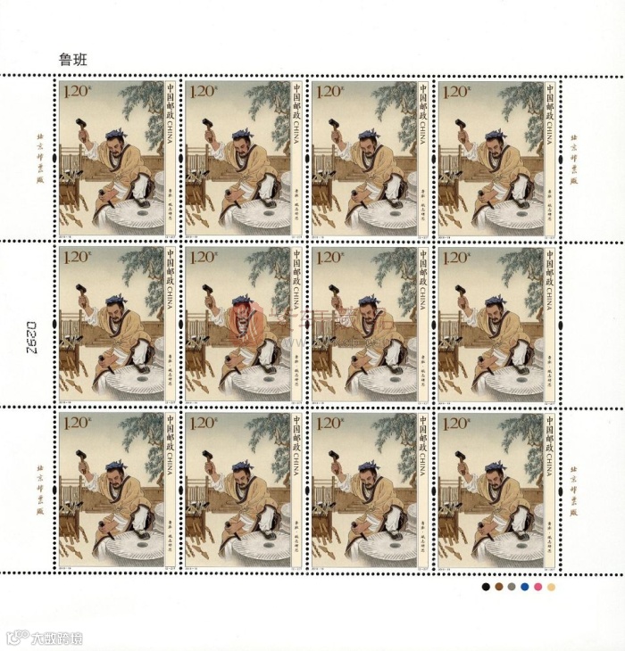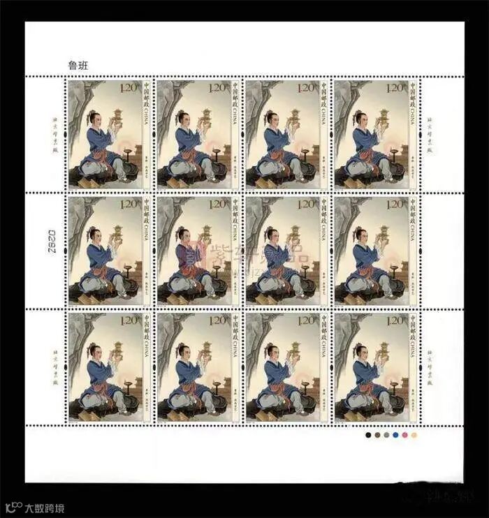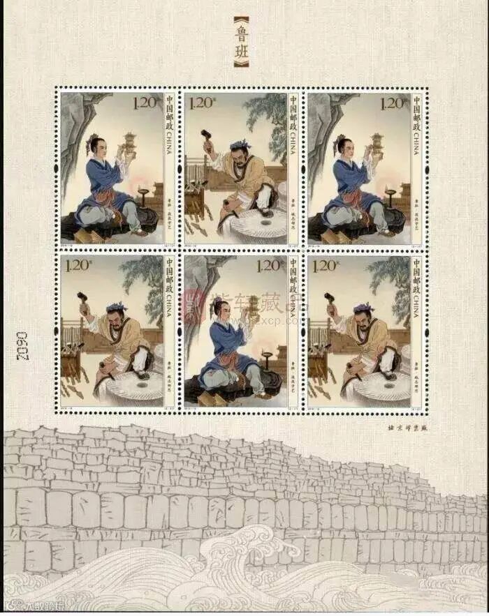 《鲁班》特种邮票由邮票设计家孟繁聪设计,采用工笔重彩的创作手法,画面构图饱满、敷色浓淡相宜、细节处理严谨细腻。第一图孜孜学艺,描绘了鲁班年轻时访得名师后,在山洞中专心研习的场景;第二图砥志研思,描绘了鲁班凿刻大石发明石磨的场景。小型张为鲁班像,描绘了鲁班手持墨斗,神情坚毅、目光炯炯,这是千万工匠不断钻研、追求极致的真实写照,也是“工匠精神”的生动体现。