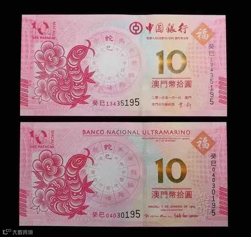 二、冠字新;澳门生肖对钞以干支纪年作为冠字在近代钞票中属首次(如壬辰龙对钞使用“壬辰”中文冠字);