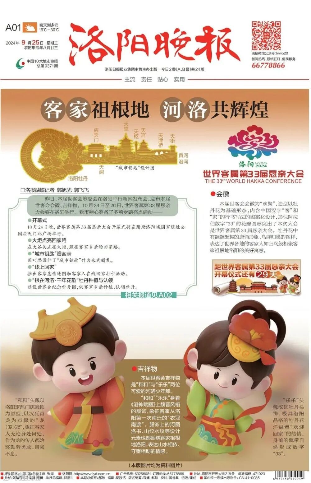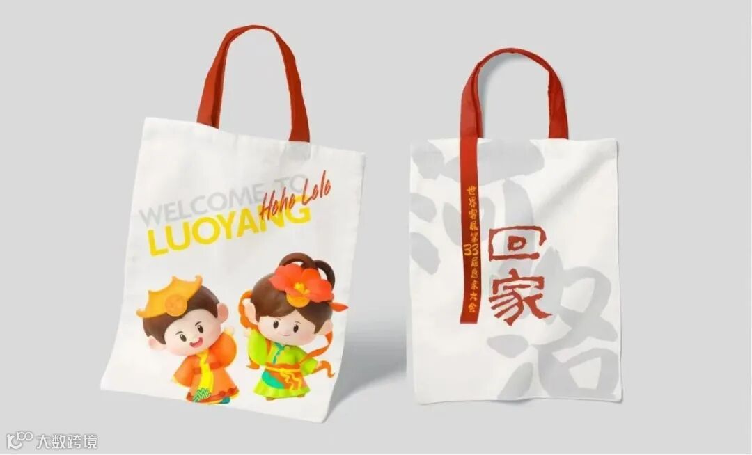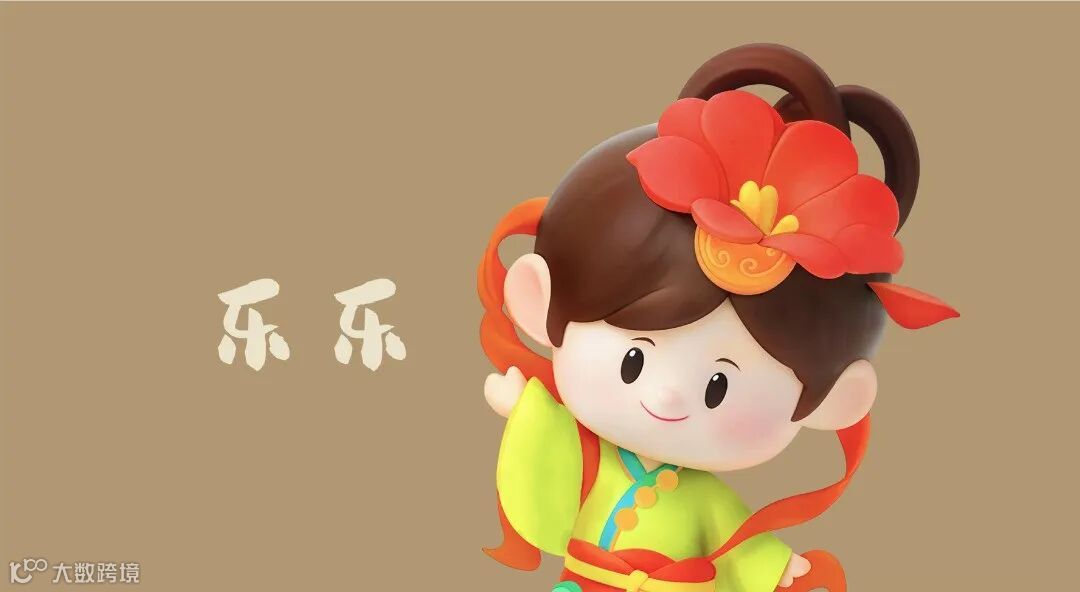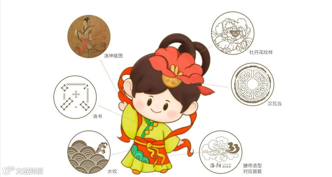 “乐乐”头戴汉瓦发髻牡丹头饰,极具洛阳品格的牡丹花开富贵洋溢着“欢迎回家”的热情,身前的飘带自然形成数字“33”点题在洛阳召开的世界恳亲大会的届数。