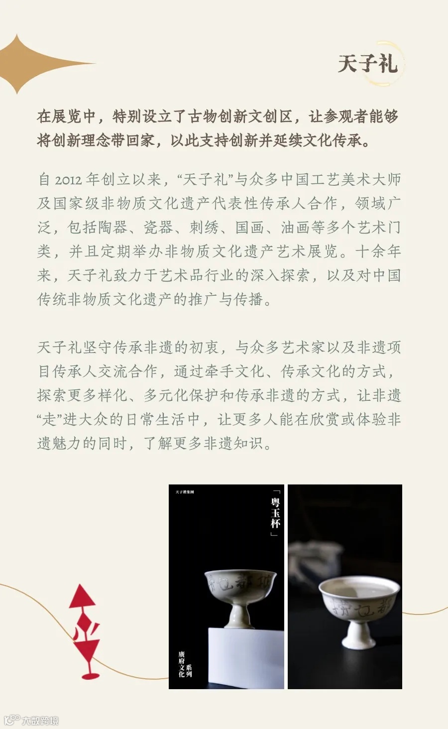为了促进非物质文化遗产及技艺的保护与传承,展示传统文化与现代设计的融合创新,广州市古玩行业协会-古物创新专委会与广州设计周组委会在「2024当代艺文周」联合举办“古物创新”特展,同时天子礼品牌受邀共赴2024广州设计周“古物创新”展览。