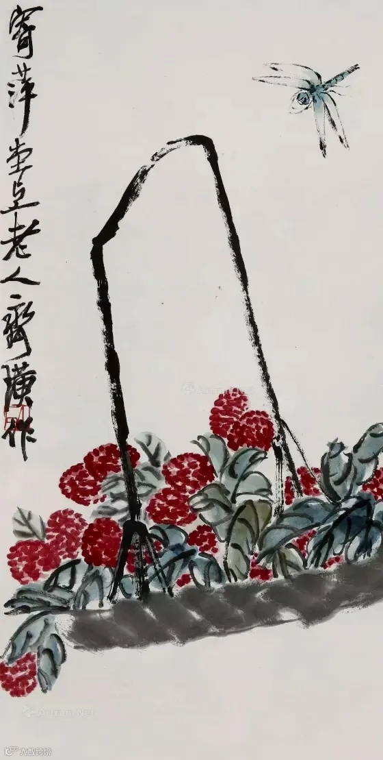 “为万虫写照,为百鸟张神。”在此幅竖式构图的《荔枝蜻蜓》,齐白石以浓重的洋红写出荔枝,腥红色泽,蜻蜓体态轻盈、神采奕奕。