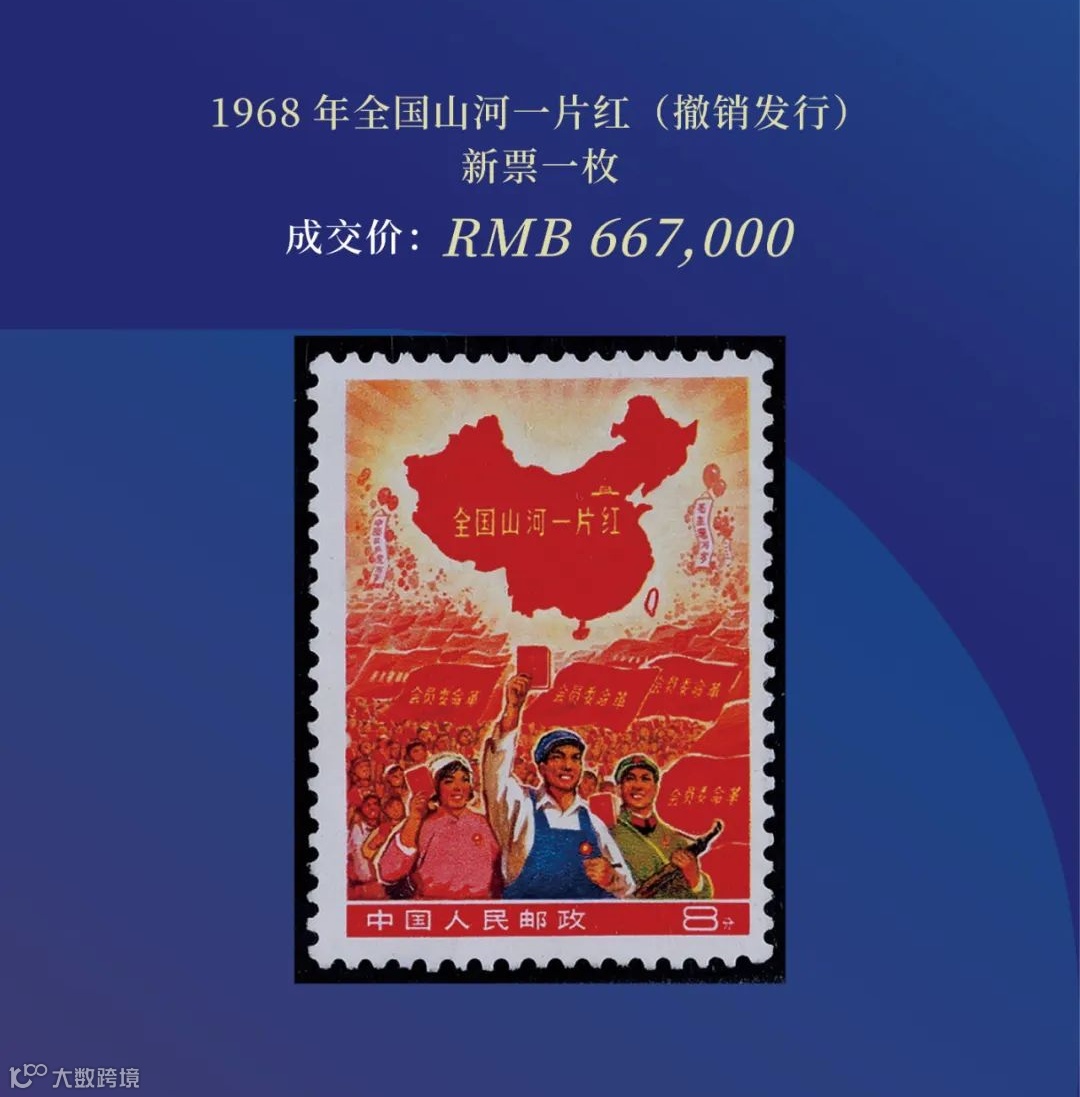 在本月结束的2024年保利春拍上,一枚1968年全国山河一片红(撤销发行)新票拍出了66.7万的高价!