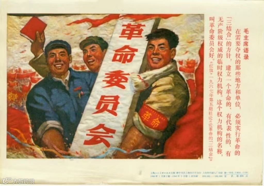 邮票图案为工农兵手持《毛主席语录》,背景中“革命委员会”的红旗汇成海洋,工农兵群众热烈欢呼。