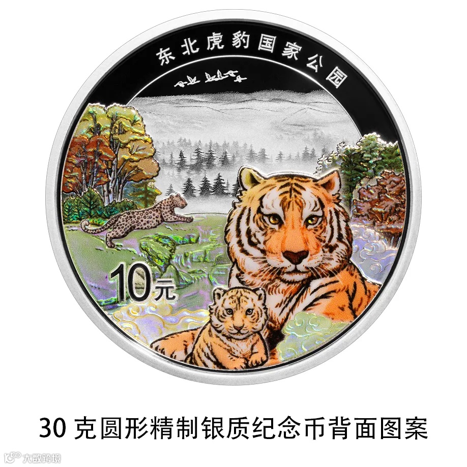 30克圆形银质纪念币背面图案为东北虎、东北豹、红松、白桦等元素装饰组合设计,并刊“东北虎豹国家公园”字样及面额。
