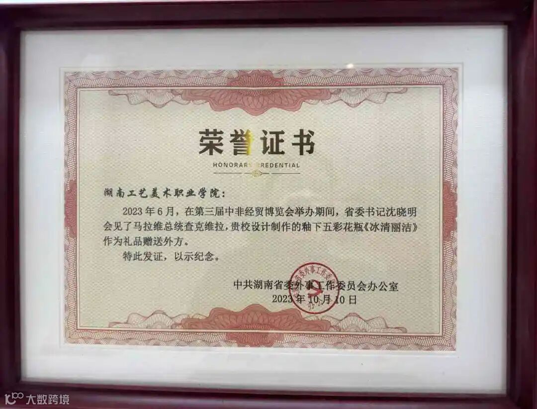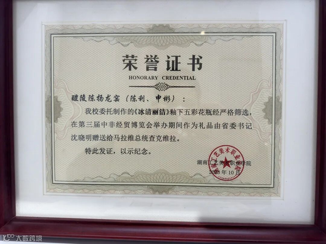 在第三届中非经贸博览会举办期间,湖南省委书记沈晓明会见了马拉维总统查克维拉,由湖南工艺美术职业学院委托陈扬龙窑设计制作的釉下五彩花瓶《冰清丽洁》作为“中国礼物”赠送外方。