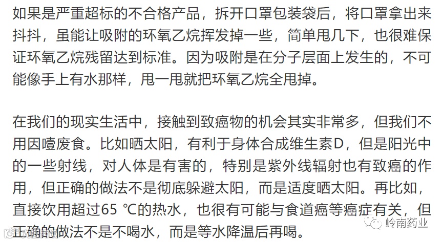 对口罩而言,环氧乙烷杀菌是目前最为合理的杀菌方式之一。过去,口罩为防止疫情扩散做出了巨大的贡献,在疫情依然肆虐的今天,口罩的防护作用依然实实在在。尽管口罩有环氧乙烷残留,但只要残留符合标准,我们就无需过度担忧,更没有必要因为恐惧致癌物而不敢戴口罩。