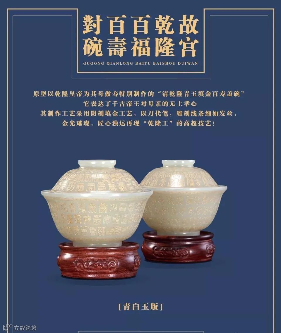 乾隆皇帝生母崇庆皇太后是一位福寿双全的盛世太后。乾隆多次主持庆典活动,多奉茶与前,表达对皇太后的尊崇与礼遇,是一位极重孝心的孝子。《故宫乾隆百福百寿对碗》原型是清乾隆青玉填金百寿盖碗精细篆字百寿,为标准宫廷造办。