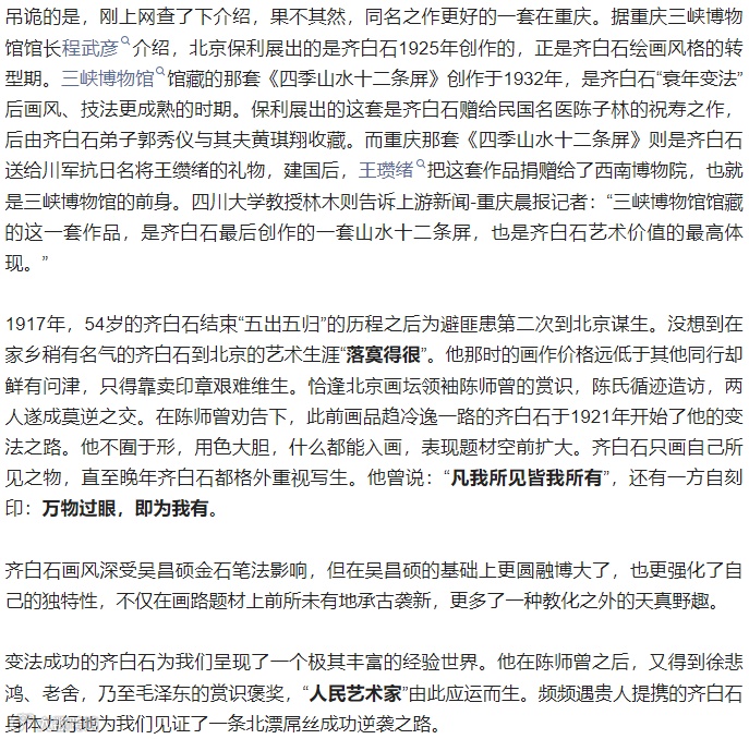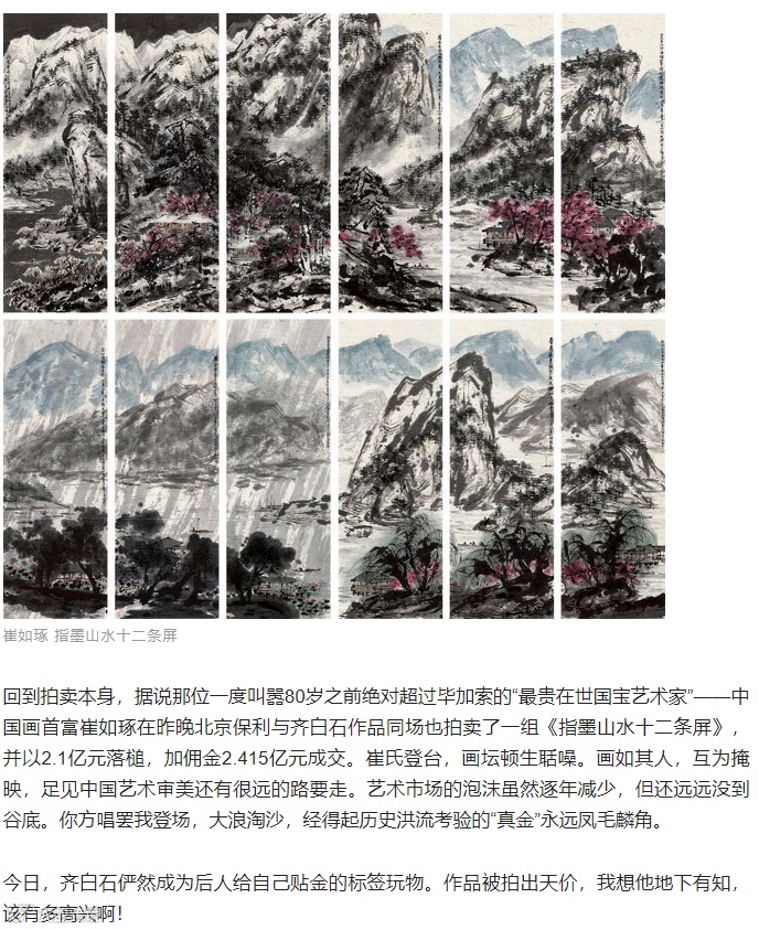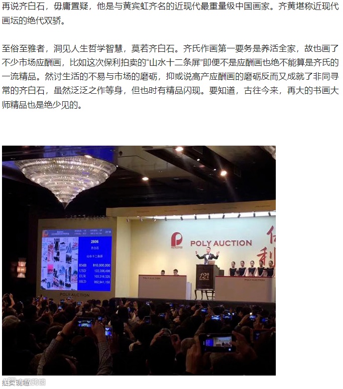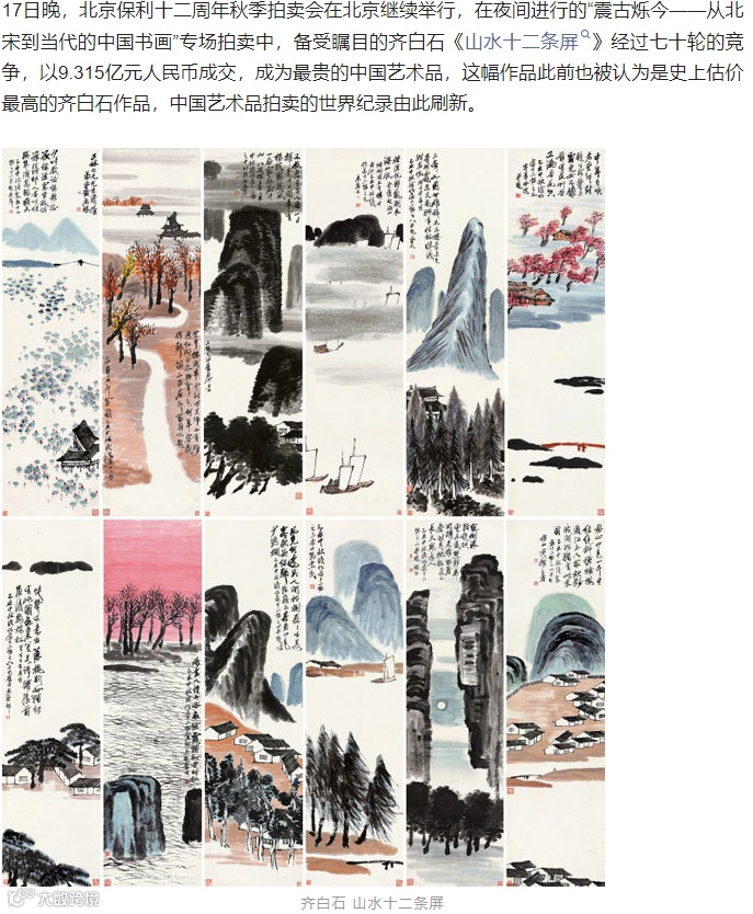 导读:北京保利十二周年秋季拍卖会在北京举行,在夜间进行的“震古烁今——从北宋到当代的中国书画”专场拍卖中,备受瞩目的齐白石《山水十二条屏》经过七十轮的竞争,以9.315亿元人民币成交,成为最贵的中国艺术品,