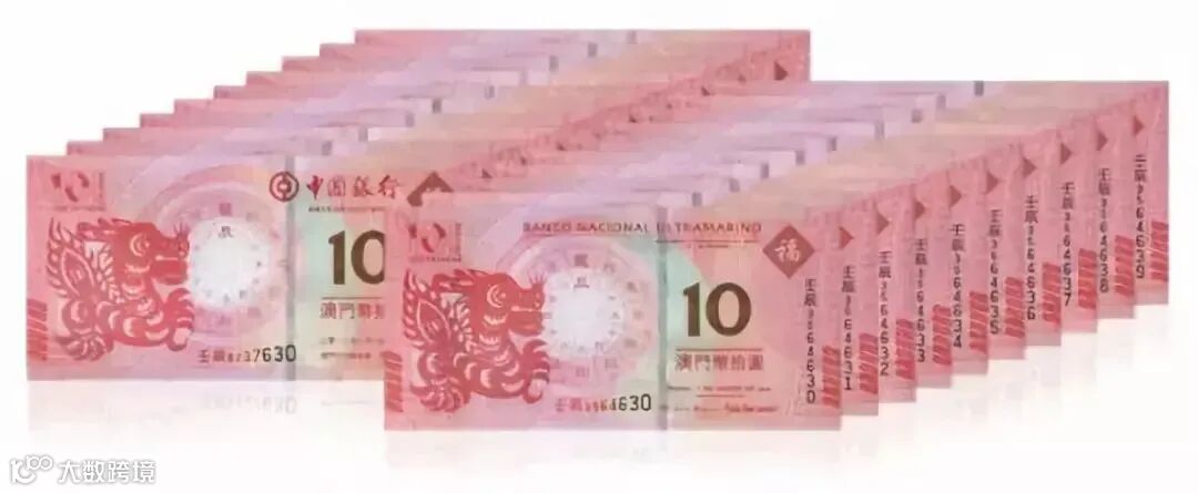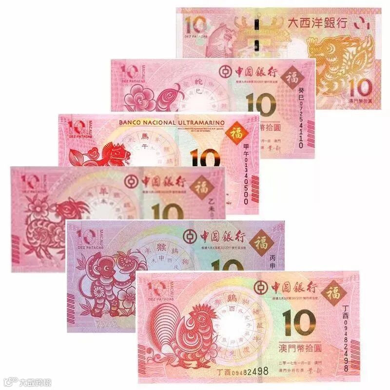 为庆祝中国农历新年,澳门特区将首次发行生肖纪念钞。大西洋银行(B.N.U.)及中国银行澳门分行(B.O.C.)将从2012年起至2023年,每年发行以当年中国传统生肖为主题、面额为10澳门元的新纸币。每年的传统生肖图案将分别印在生肖钞票上。2012 年1 月,澳门两家发钞银行将为「龙年」发行第一款农历新年10元纸币,以庆祝中国新年。