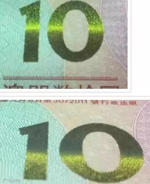 票面中央的面额“10”采用光彩光变油墨。随着观察角度的改变,额字颜色在绿色和金黄色之间交替变化,并可见到一条亮光带上下滚动。这和目前新版人民币的光彩油墨一致,具有较高的防伪水平。
