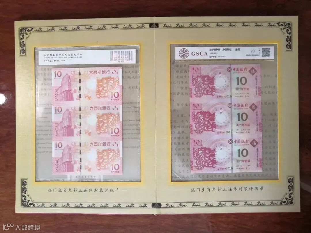中国银行澳门分行与大西洋银行同时发行了壬辰龙年生肖贺岁钞。这两款龙年生肖贺岁钞都以红色为主色调,正面主景为列入“人类非物质文化遗产代表作名录”的中国剪纸生肖“龙”,背面主景分别为中国银行澳门分行大厦与大西洋银行大厦,衬景一致选用列入“世界历史遗产名录”的澳门妈祖庙。此款藏品收录有大西洋银行和中国银行澳门分行发行的2012龙年生肖纪念钞三连体各一张,两张钱币的号码完全相同,称之为全同号。全球限量发行不足几百套,更是少之又少。