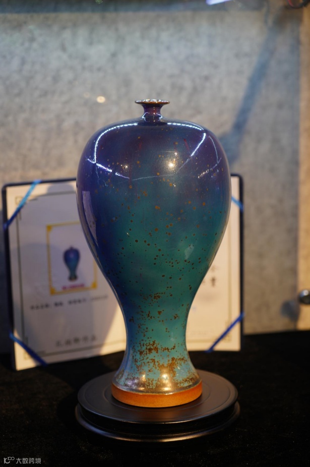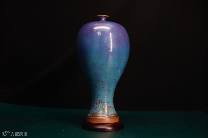 在钧瓷领域,「红为贵,紫为最」是公认的审美标准。瓶身施彩经高温窑变后幻化出茄皮紫、海棠红、丁香紫、朱砂红、玫瑰紫等多种窑变色彩,红里有紫、紫中有蓝、蓝里泛青、青中透红、青蓝错杂、红紫相映,于自然窑变中产生艺术画面,宛如天空中出现的一片绚烂彩霞,又宛如盛放的花海中红花绿叶,五彩渗化,交相辉映,热烈奔放。