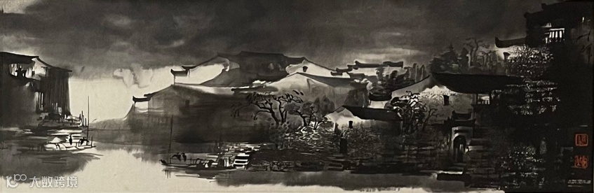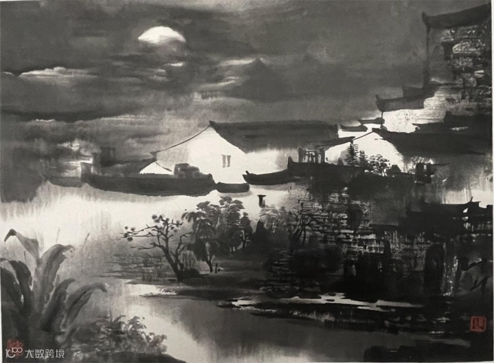·画面中初看墨色稍重,细看在暮色笼罩中,笔笔传神写意勾勒着高低错落的青瓦白墙,浓淡墨色运用高超。描绘的皖南夜暮的温柔宁静,令人憧憬,令人神往。