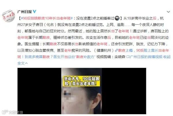 近日,据广州日报微博报道,18岁高中毕业之后,杭州27岁女子唐羽(化名)就没有在凌晨2点之前睡过觉。上网、追剧……每一个夜深人静的时刻,都是她与自己的狂欢时分。然而最近,她的脸上居然长出了老年斑!通过诊断,唐羽脸上的老年斑属于长期熬夜、精神状态差引发的。改变生活作息后,目前她的老年斑已经出现淡化的迹象。