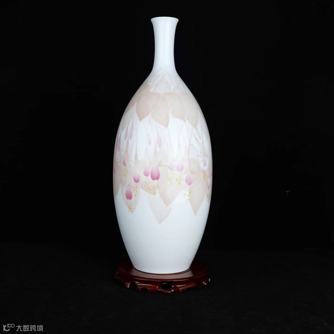 此件作品造型为国家级非遗代表性传承人陈扬龙先生早年设计,撇口、细长颈,腹部微曲修长,脂玉泥制作,醴陵窑核心技艺“薄施淡染”技法绘制。作品用色彩、线条把主观感受呈现为一幅和谐的画面,雅致的灰调是近年的实验成果,亦是心灵的外化。采用装饰性表现手法,点,线,面层层叠加。结合瓶性的完美结合,将吊钟花的垂坠美优雅美尤如含苞待放的少女即将翩翩起舞,充满期待。