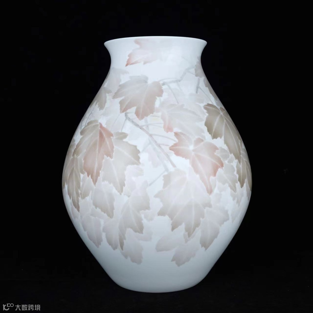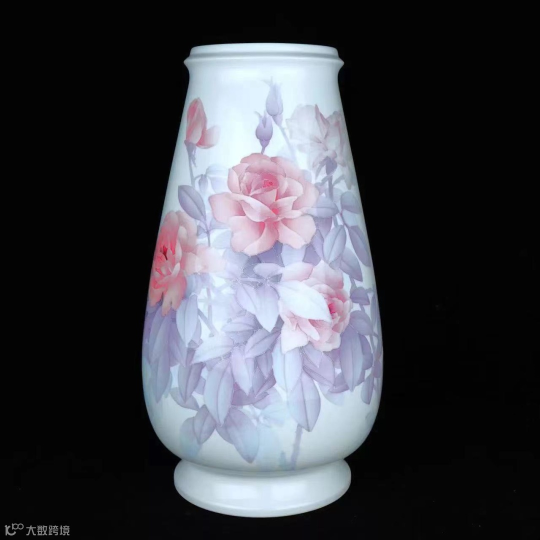 作品取稀缺高岭土制成,选料上乘。造型直口,带颈圈,长弧形腹壁,近足处内敛,圈足,形制。作者以娴熟高妙的“薄施淡染”技艺,绘制数朵芙蓉。珠玉润白,花为秘制色,首次出现于作品中;“以白衬白”的大胆艺术表现,配以“监德蓝”叶色,令瓷更温润,色更脱俗。芙蓉多以花红叶绿为常,而以此色料为材者相当罕见。“淡极始知花更艳,花到无艳始称绝”,正如其素雅高贵,亦胜过万千姹紫嫣红。