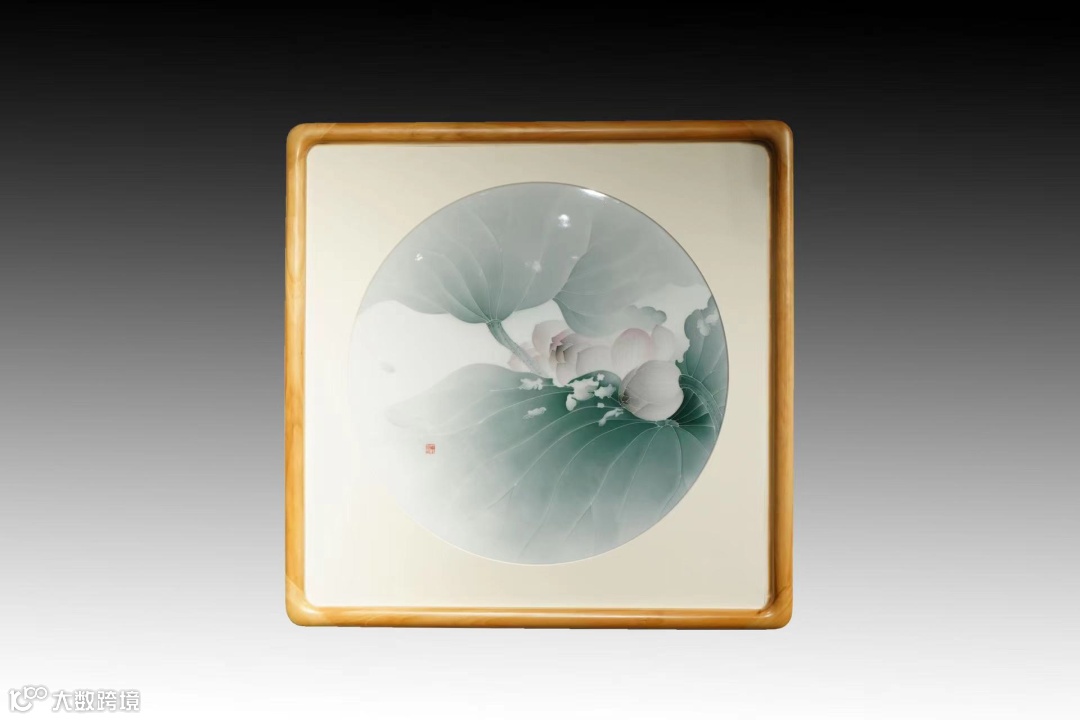 作品取17#稀有高领土制成,光亮清澈、质地温润,此为作者首块圆板作品,核心工艺“薄施淡染”法绘制。构图舒朗,荷叶卷舒间,从容浅淡,巧妙天真。荷花取老料,半年调配出“翕歙”(xi-xi\)色,将荷花的绵婉出尘发