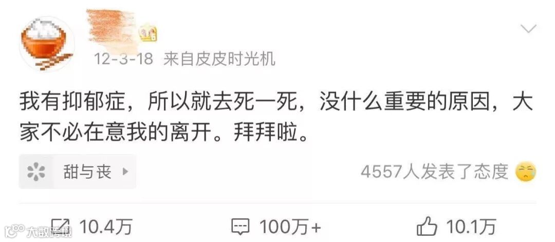 曾经有一个抑郁症的朋友在最难熬的时候问我,人生是我自己的,为什么我不能选择死? 很多时候人沉浸在巨大的痛苦之中,难免会各种各样非理性的冲动。但想一想我们平时点什么外卖,下午喝一点点还是喜茶,都要想半天。今天要不要去死这件事,怎么样也值得给自己三年五年想清楚。