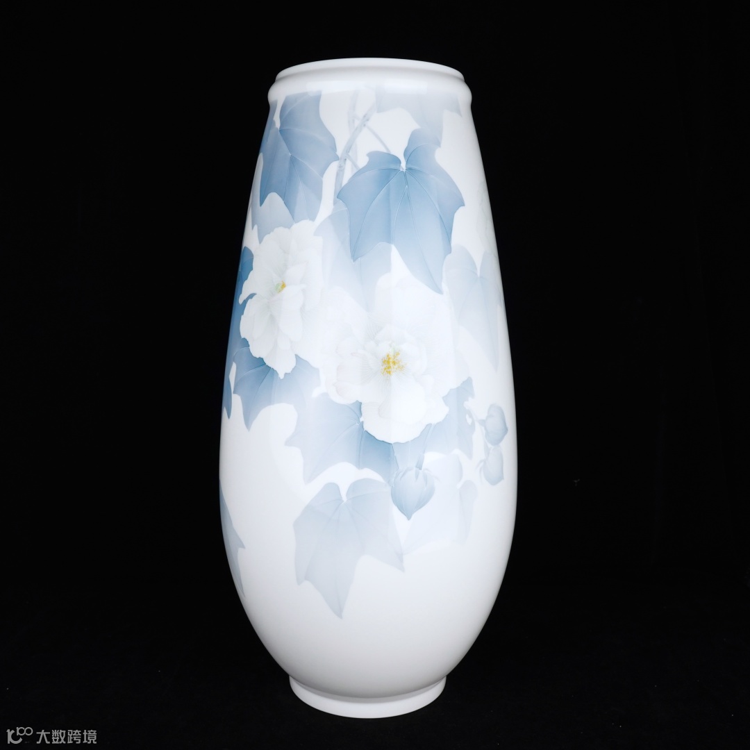 作品取稀缺高岭土制成,选料上乘。造型直口,带颈圈,长弧形腹壁,近足处内敛,圈足,形制。作者以娴熟高妙的“薄施淡染”技艺,绘制数朵芙蓉。珠玉润白,花为秘制色,首次出现于作品中;