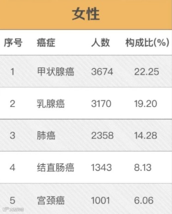 而且,女同胞还更容易中招。在2019和2020年的深圳女性新发癌症榜中,甲状腺癌甚至超过了曾经的女性第一大癌乳腺癌,排名第一位。