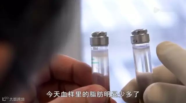 跟吃早餐前的血液样本一做对比,就能很明显看出右边试管里的脂肪层更厚。