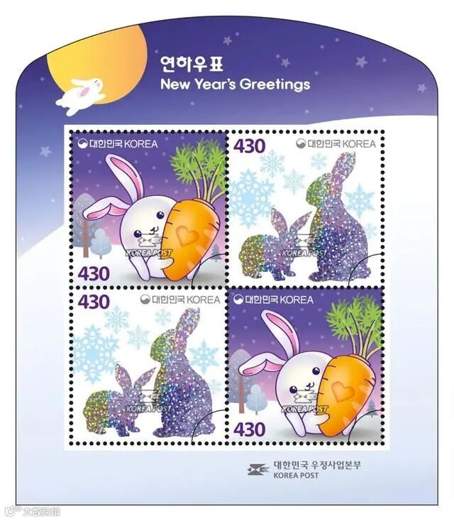 韩国邮政于2022年12月1日发行兔年生肖邮票小全张,该套邮票由申在勇设计,采用四色印刷并使用激光全息等工艺。