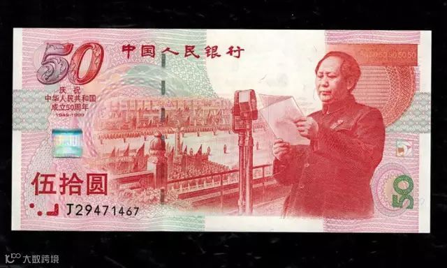 为纪念中华人民共和国建国五十周年,中国人民银行自1999年9月20日起,面向全国发行“中华人民共和国成立五十周年”纪念钞,这是中国首次发行纪念钞。与现行人民币等值流通,这是我国第一次发行纪念钞,这钞主题鲜明,寓意深刻,技术高超,代表了我国钞票设计和印制的最高水平。