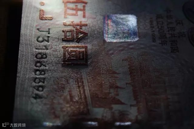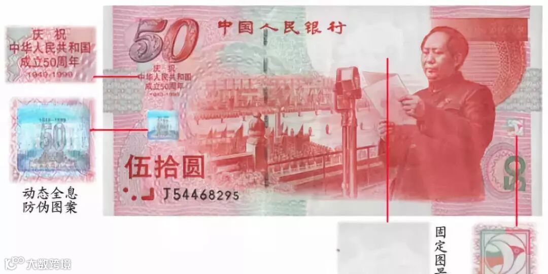 钞纸中分布不规则红蓝纤维丝;左侧贴有动态全息防伪标志;话筒上部有侧面天安门全景固定水印;右下角采用光变油墨印制面额数字50,在不同的角度看就会有颜色的变化;右上角有隐形面额数字,当眼睛与票面平行时,迎着光能看到50的字样。
