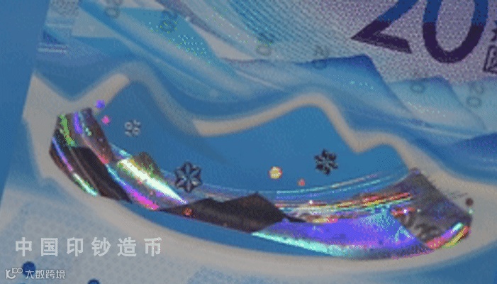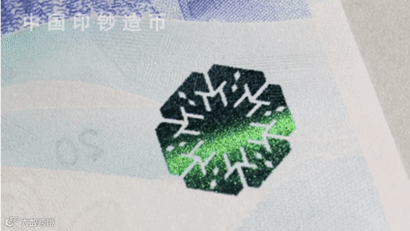 位于票面背面下方。改变观察角度,“雪花”图案的颜色在绿色和蓝色之间变化,并可见一条亮光带上下滚动。