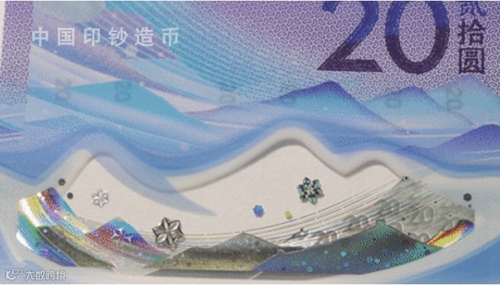 位于票面正面面额数字下方。透光观察,可见第24届冬季奥林匹克运动会吉祥物“冰墩墩”图案的多层次水印。