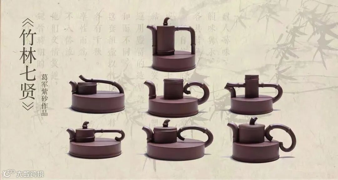 2010年设计《竹林七贤》套组壶,以竹段为素材,和而不同,运用丰富的造型语言,结合紫砂泥突出的可塑性,成功塑造出七贤各自「任自然」的艺术形象,各具特色,韵味隽永,耐人寻味。