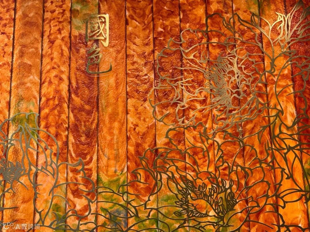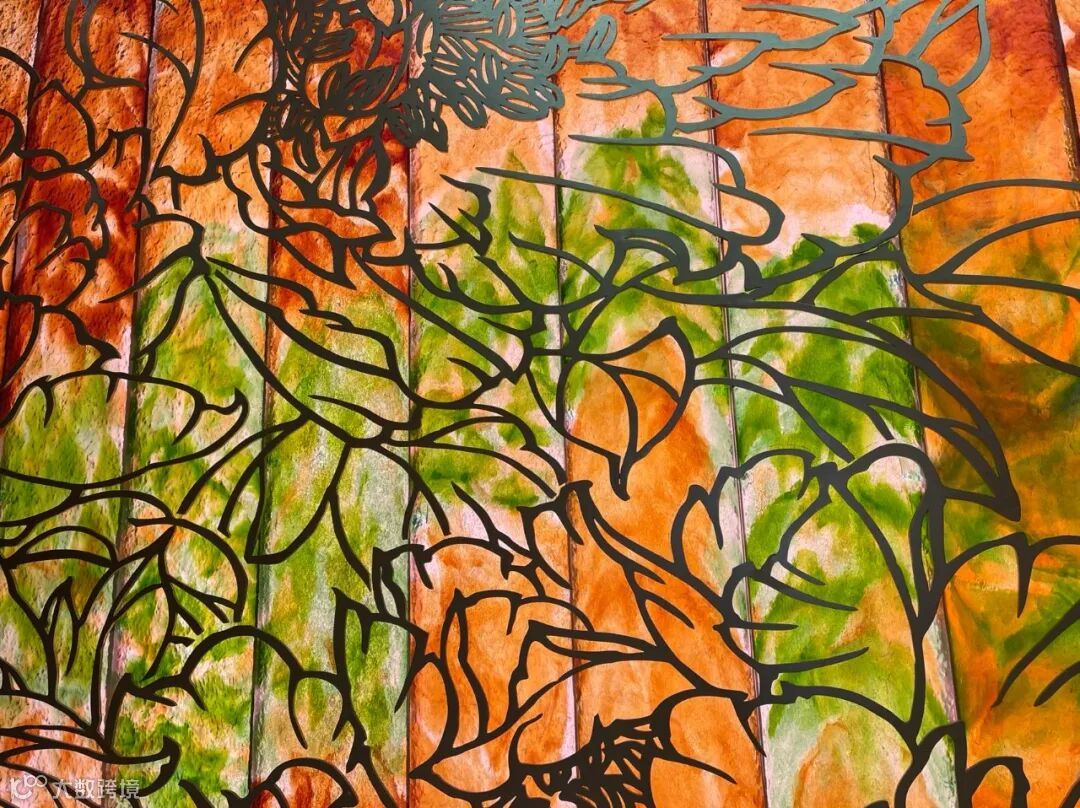 以三十六条五彩琉璃写意浮雕拼接成的大型牡丹三彩琉璃艺术