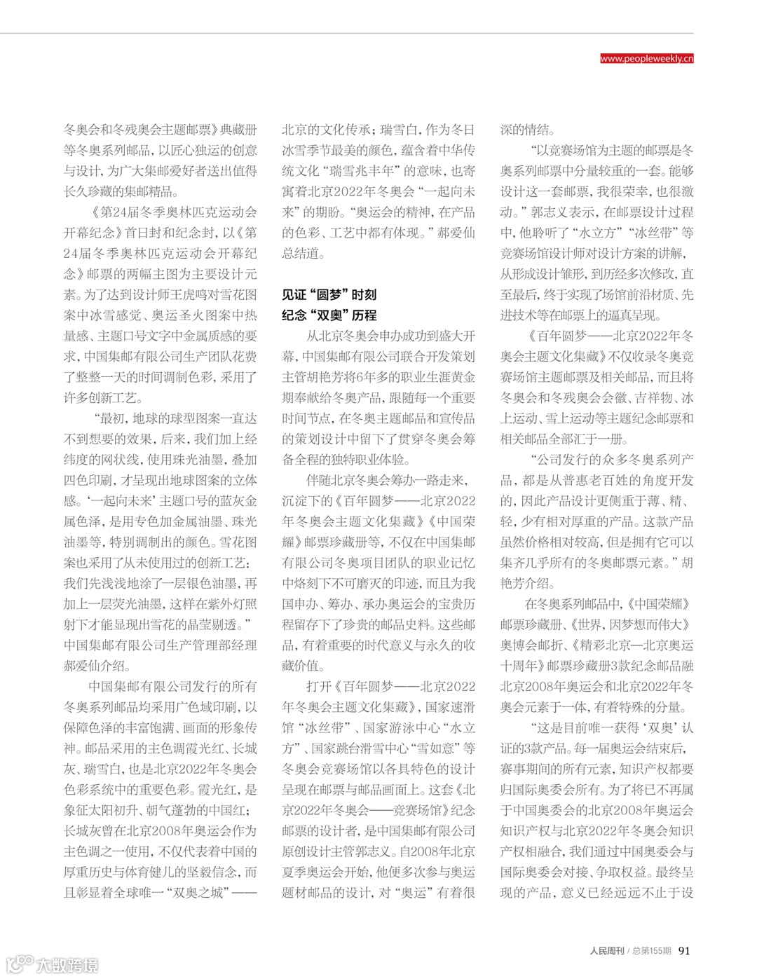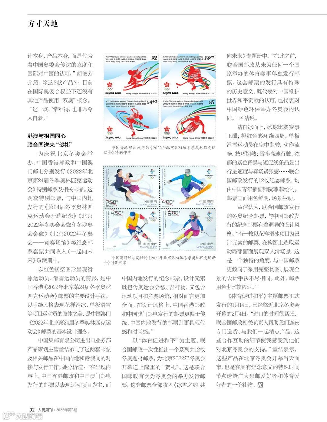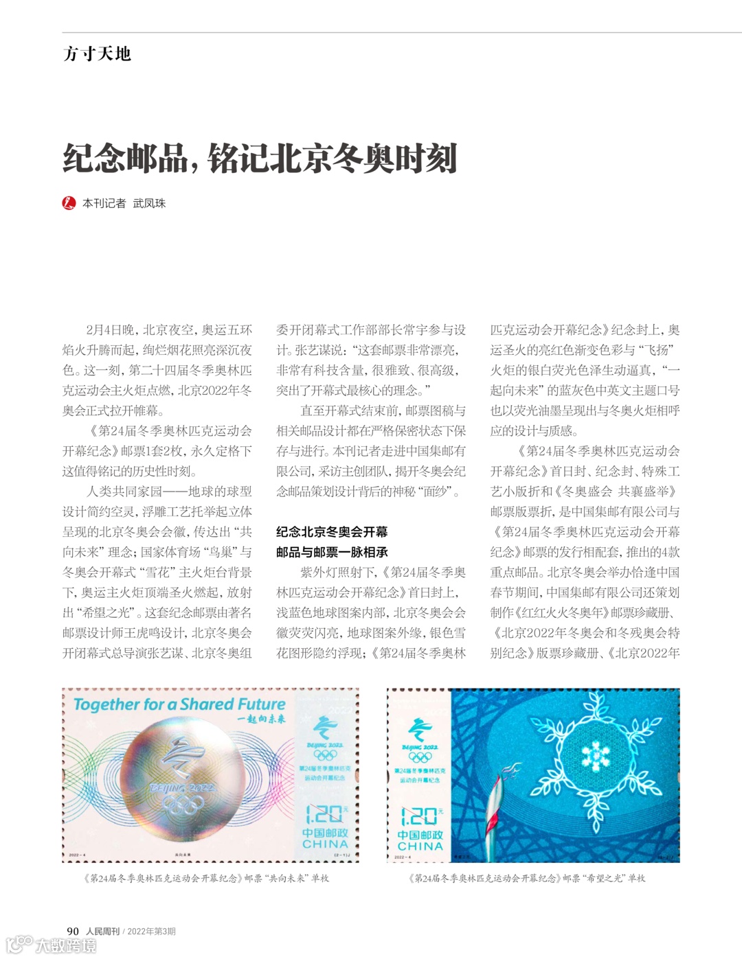 2022年2月4日,北京冬奥会盛大开幕,中国邮政发行《第24届冬季奥林匹克运动会开幕纪念》纪念邮票一套2枚,围绕该套邮票中国集邮有限公司策划制作了多款各具特色的集邮品。《人民周刊》2022年第3期以《纪念邮品,铭记北京冬奥时刻》为题做了专题报道,现将此文转载以飨读者。