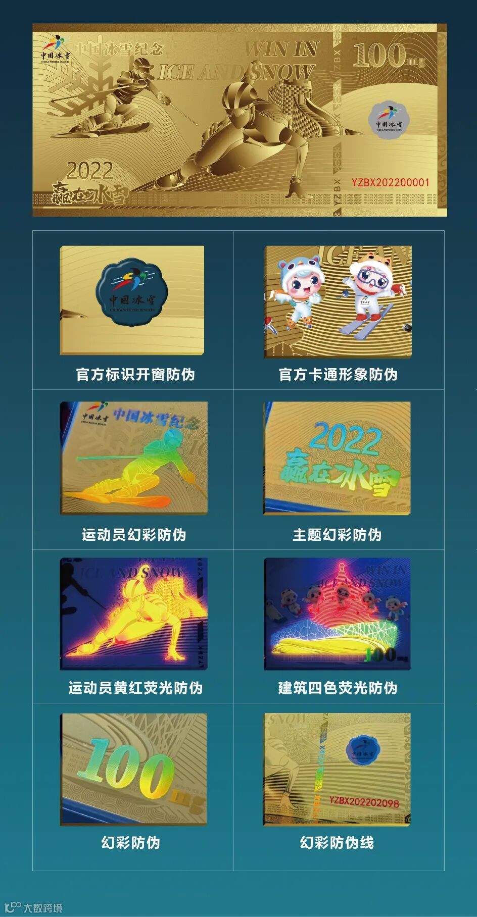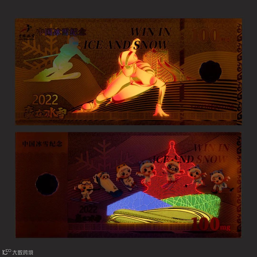 大面积的彩印,呈现出缤纷多姿的冰雪世界,滑雪者、2022赢在冰雪综合运用了荧光防伪、镭射幻彩防伪、开窗镂空、镭射防伪线等国际领先的工艺!