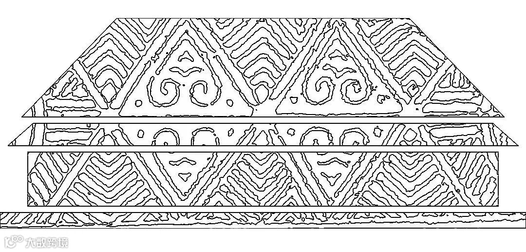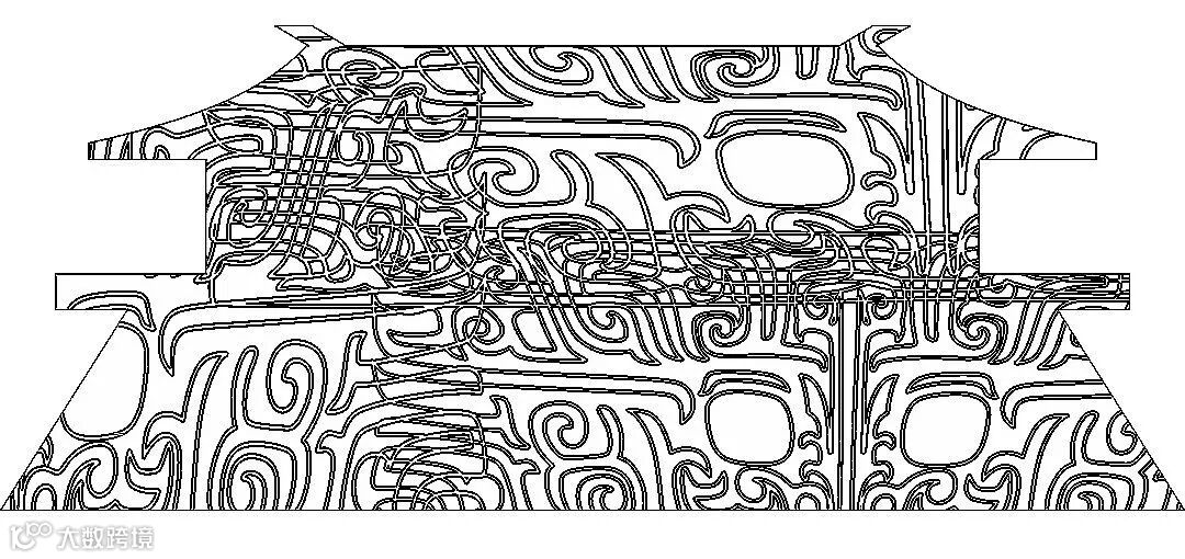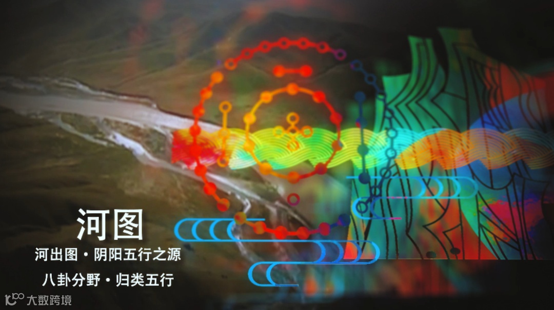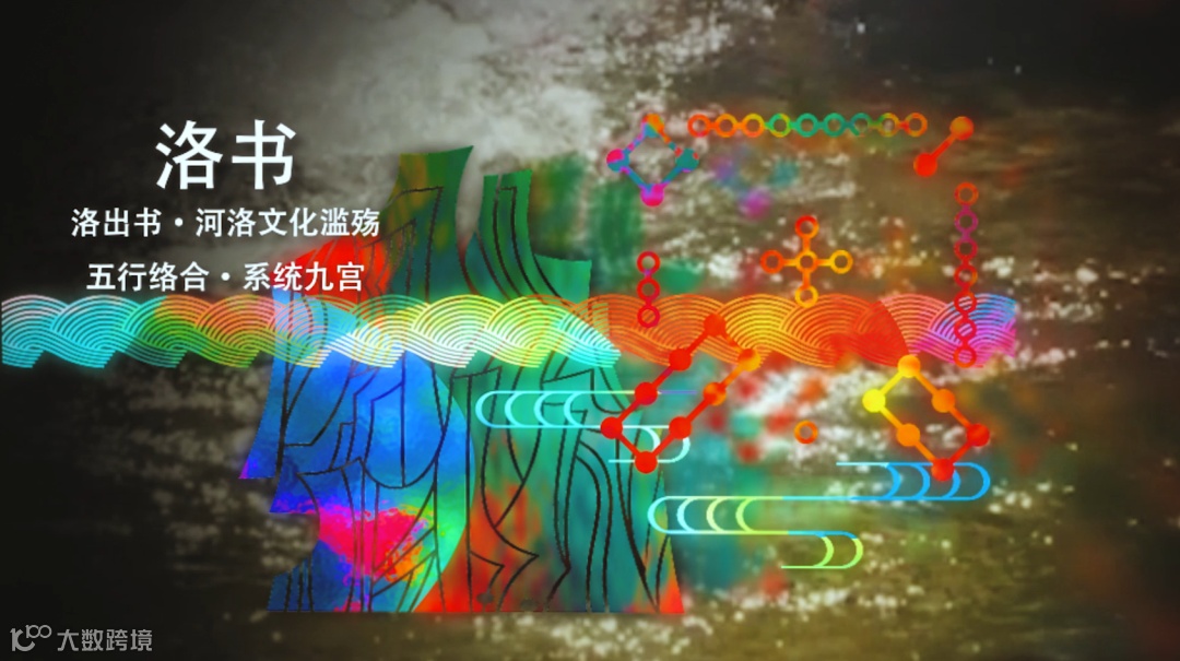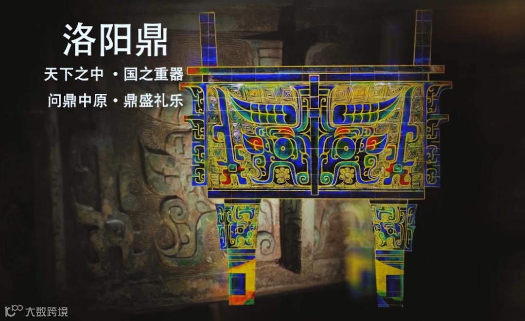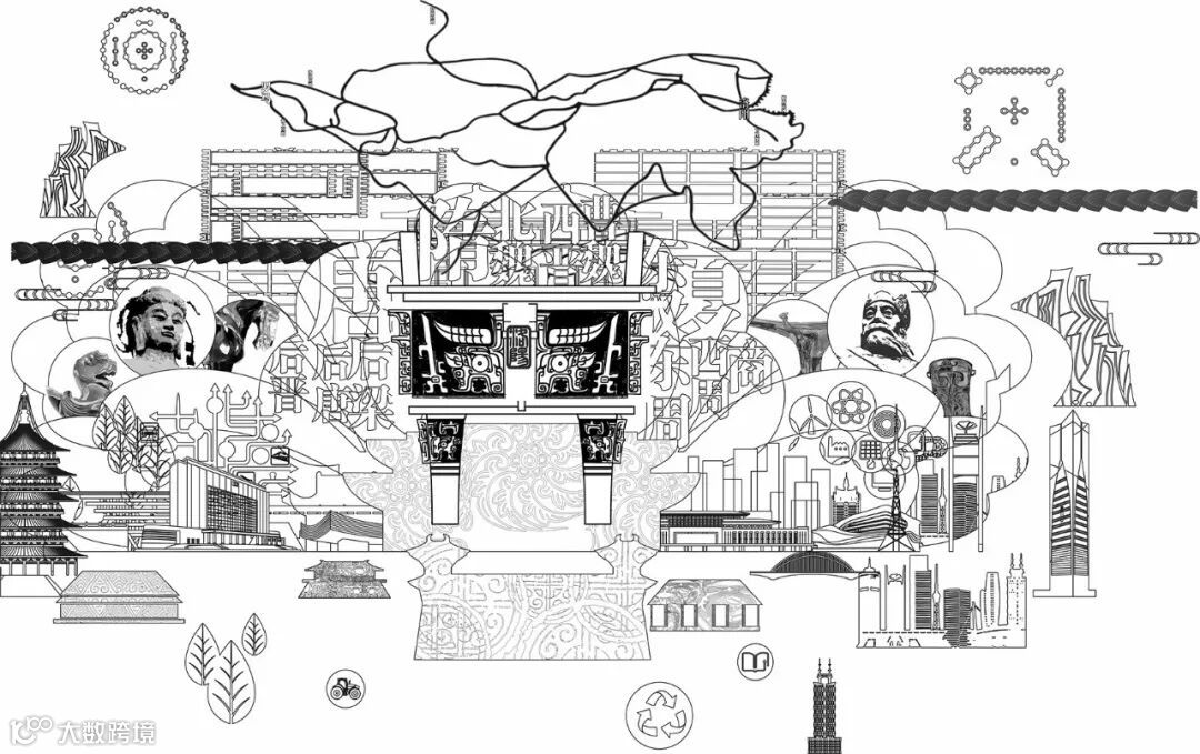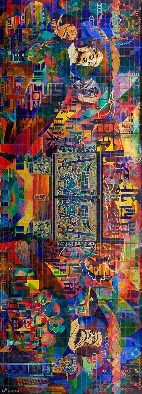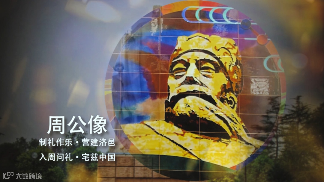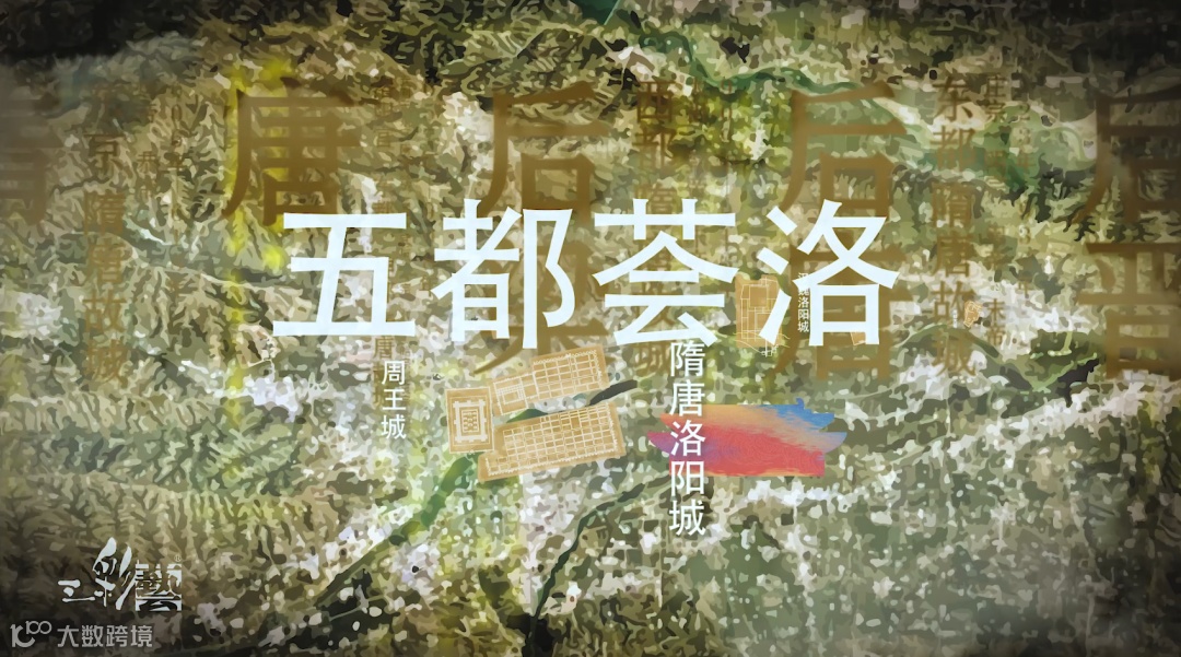 历史轴线中,传承中国古代“择天下之中而立国”的规划思想,国之重器西周洛阳青铜方鼎雄踞其中,在洛阳建都的夏、商、西周、东周、东汉、曹魏、西晋、北魏、隋、唐、后梁、后唐、后晋十三朝左右环绕,彰显洛阳华夏文明中心的历史地位。大鼎之上,在中国古代最华丽的都城中轴线“隋唐洛阳城”映衬之下,“定鼎门”巍峨壮观;隐逸其中的隋唐运河、万里茶道、草原丝路、沙漠丝路、海上丝路构成“五路通洛”,洛阳以丝路文明的起点贯穿东西;大鼎之下,在夏都斟鄩、商都西亳、周王城、汉魏故城和隋唐洛阳城五大都城建筑的剪影在壁画中轴叠加组成“五都荟洛”,洛阳城建的历史源远流长。河洛文化的滥觞,中华文明源头的“河图洛书”左右环绕,作为背景的山峦与黄河、洛河、伊河、瀍河、涧河“五水融洛”所构成的河洛水纹为洛阳“山河拱戴,形胜甲于天下”作了充分注脚。在盛开的牡丹花瓣上散落着石辟邪、卢舍那、三彩马、青铜爵、周公像、绿松石牌饰等河洛遗珠。其中礼乐文明的开创者周公,也是中国古代城市规划的鼻祖,“周公定鼎,以礼营城”的城市规划思想,在数千年的中国都城营建史上,有着重大而深远的影响。与周公相对应的是世界文化遗产——龙门卢舍那大佛,她的原型武则天同样在洛阳城市规划史上留下了浓墨重彩的一笔,她修建的天堂明堂等建筑构成了隋唐洛阳城壮丽的天际线。