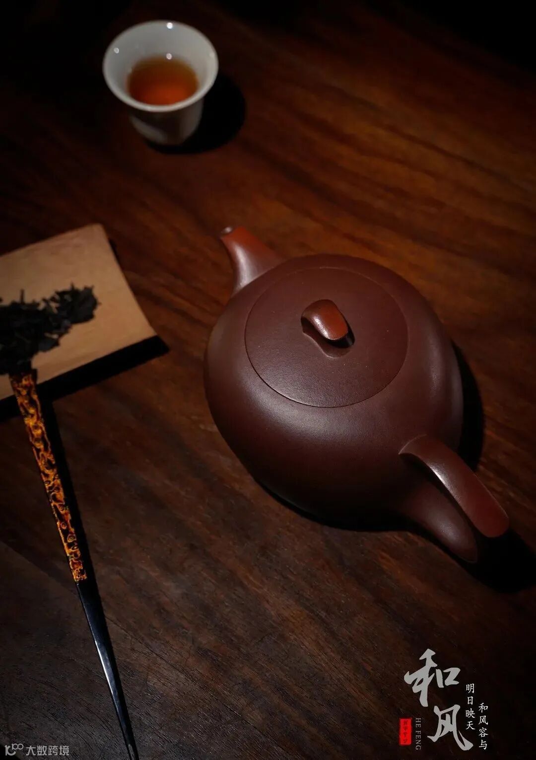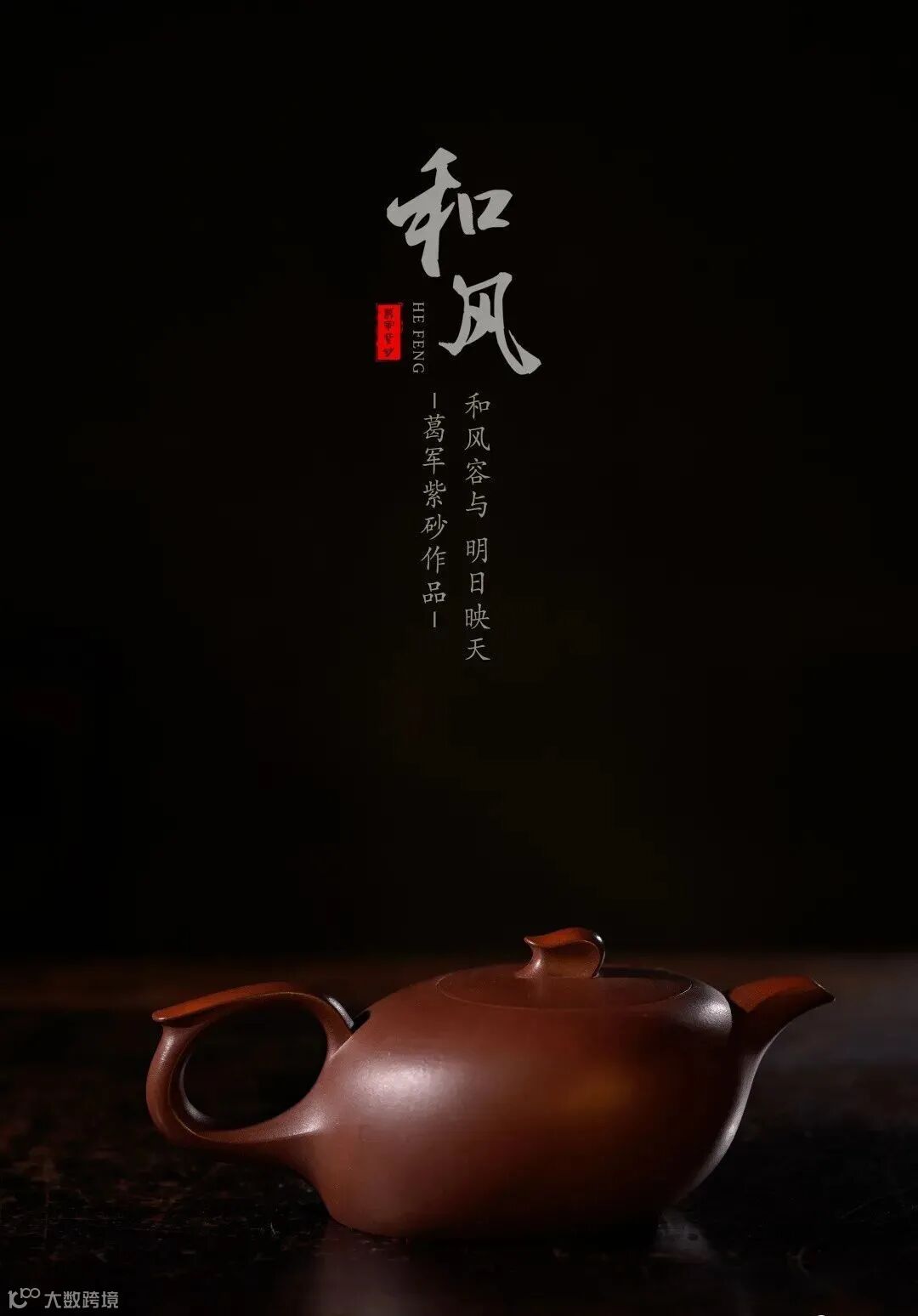 壶嘴和壶把侧看成一弧线,似风起云涌,蕴藏力量。盖滴如发丝,迎风飘扬, 踌躇满志。壶钮和壶把的耳微微翘起,给倾斜的壶身以平衡之感。无形的力量成就了此壶的造型,整体线条流畅温润。