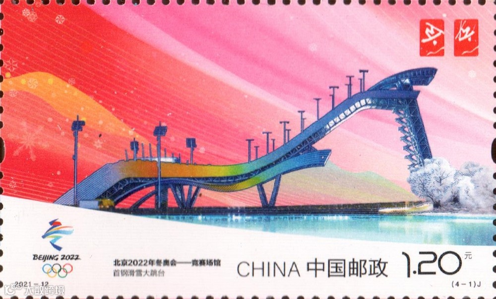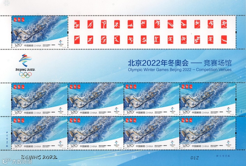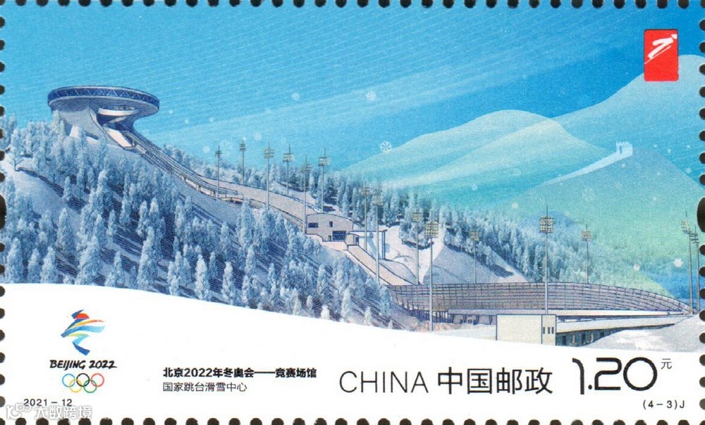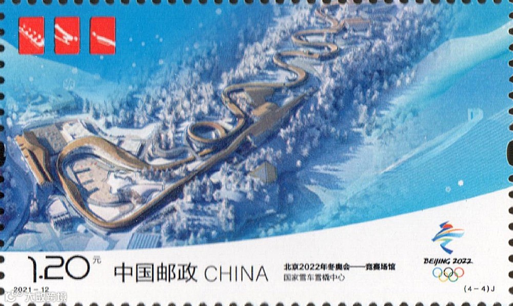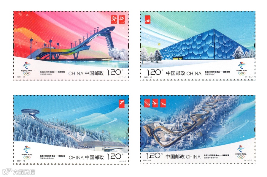 《北京2022年冬奥会——竞赛场馆》纪念邮票内容包括首钢大跳台、国家游泳中心、国家跳台滑雪中心、国家雪车雪橇中心,小型张为国家速滑馆。该套邮票采用平面设计手法表现,画面构图饱满、色彩丰富,4枚邮票采用连票设计形式,以富有变化的曲线贯穿;小型张邮票则根据场馆的结构特点,采用椭圆形票幅展现,并在边饰中点缀雪花图形。同时该套邮票上的北京2022年冬奥会会徽和体育图标,使票面更具节奏感和韵律感。