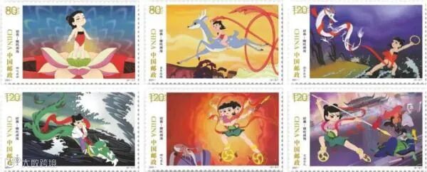 6枚邮票采用6种色调分别展现了动画中哪吒出世、童年游趣、擒拿敖丙、斗战龙王、哪吒重生、定海安民这6个故事情节。