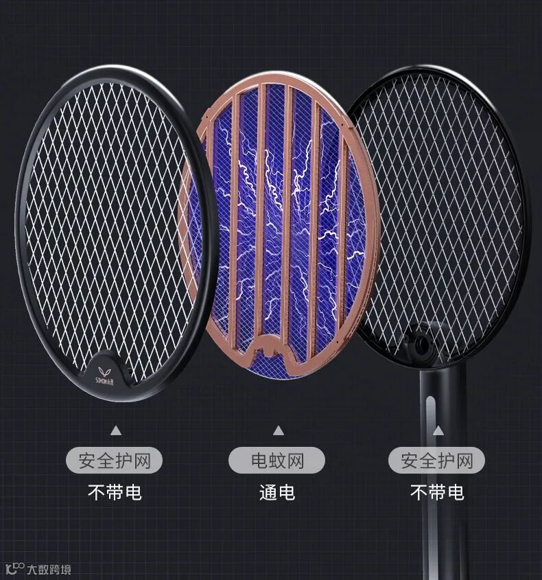 细节上,电蚊拍由3层防护安全网面组成,前后两面为安全防护网同为负极,人体接触无电流不会触电