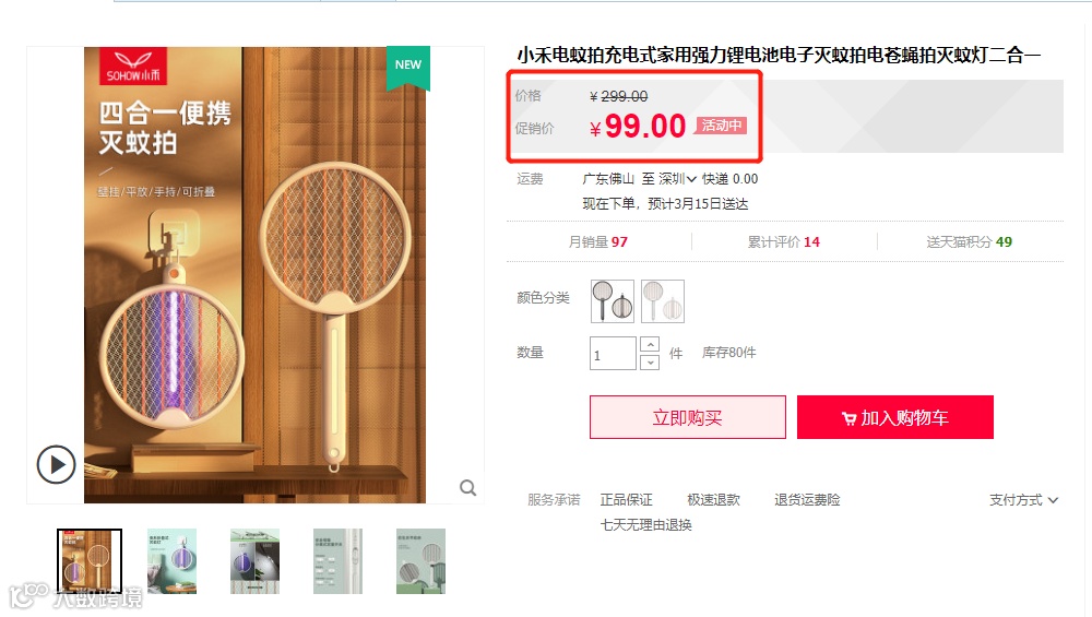 这支超全能的小禾灭蚊拍,官网原价要299,做活动最低也要99,现在我们联合品牌商做限时特惠,只要79元,立减20,全网最低!