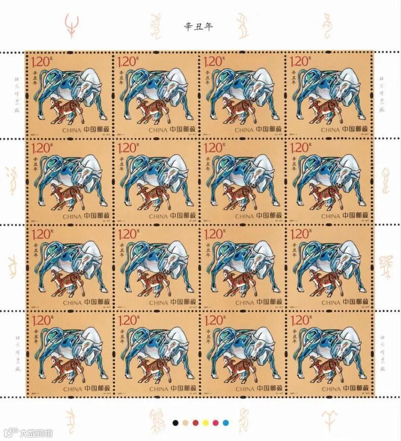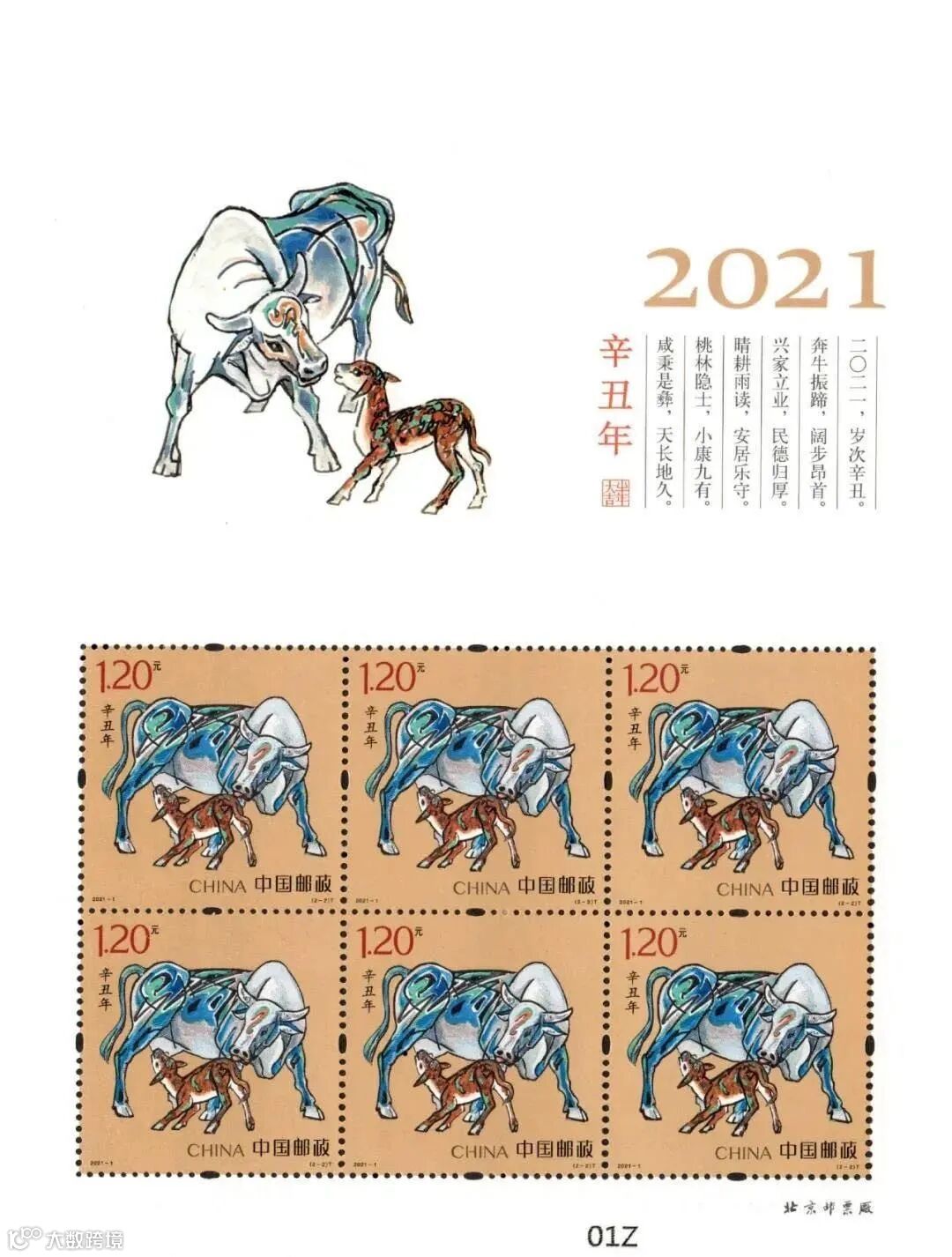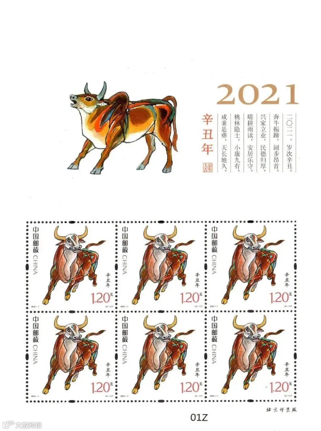 中国邮政定于2021年1月5日发行《辛丑年》特种邮票1套2枚,小本票1本。详情如下: