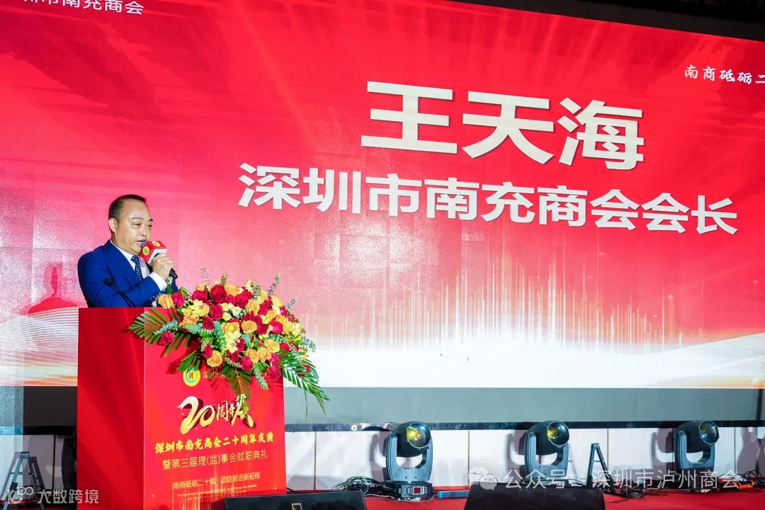 深圳市南充商会二十周年庆典暨第三届理(监)事会就职典礼在华丽雄壮的会歌《我们共创辉煌》中拉开序幕。第三届会长王天海致欢迎辞,他首先向全场所有领导及嘉宾的到来表示最诚挚的欢迎,并感谢全体会员的忘我奋斗,感谢各兄弟商协会及社会各界对商会的信任和支持。他表示,作为新任深圳市南充商会会长,将团结全体会员,努力将深圳市南充商会打造成一个具有影响力、凝聚力和创新力的商会。