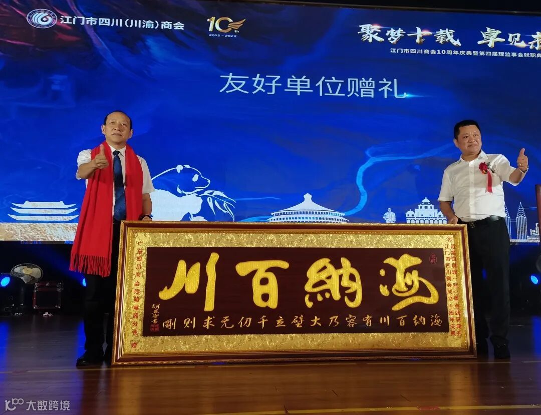 廖奎受熊宗友会长委托,代表广东四川商会和照明电器分会分别向江门市四川商会赠送礼物,衷心祝福江门市四川商会双喜临门,海纳百川,展示我们川人敢于拼搏、勇于吃苦的良好传统。