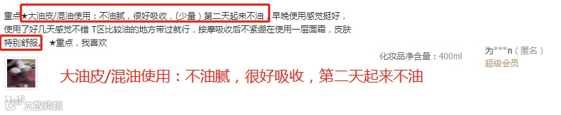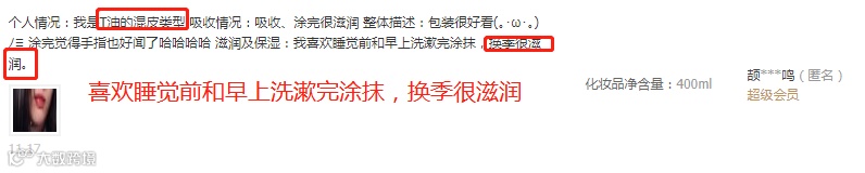 干皮爱不释手,就连油皮和混油的仙女也爱用,说它很好吸收,头天晚上用了它,第二天起来也不会油。