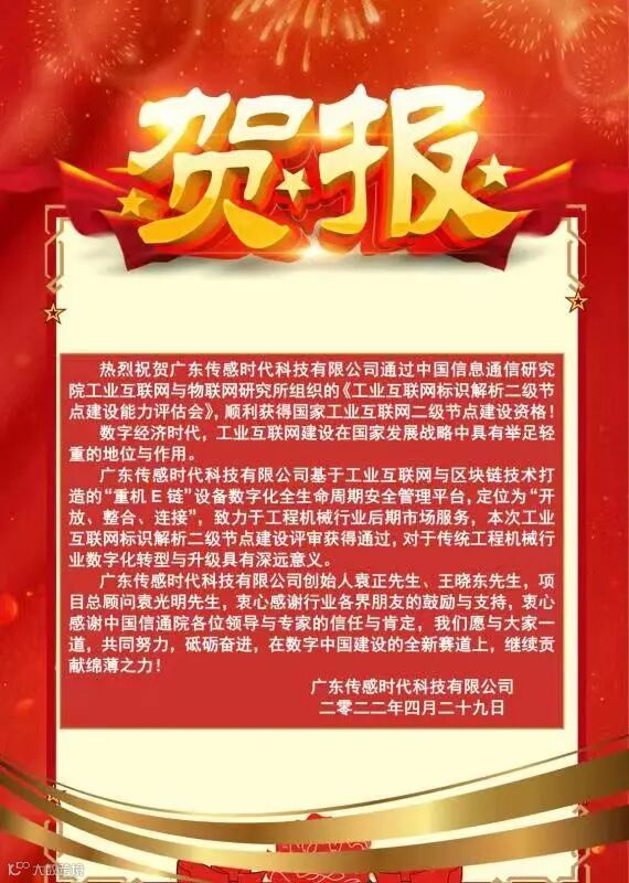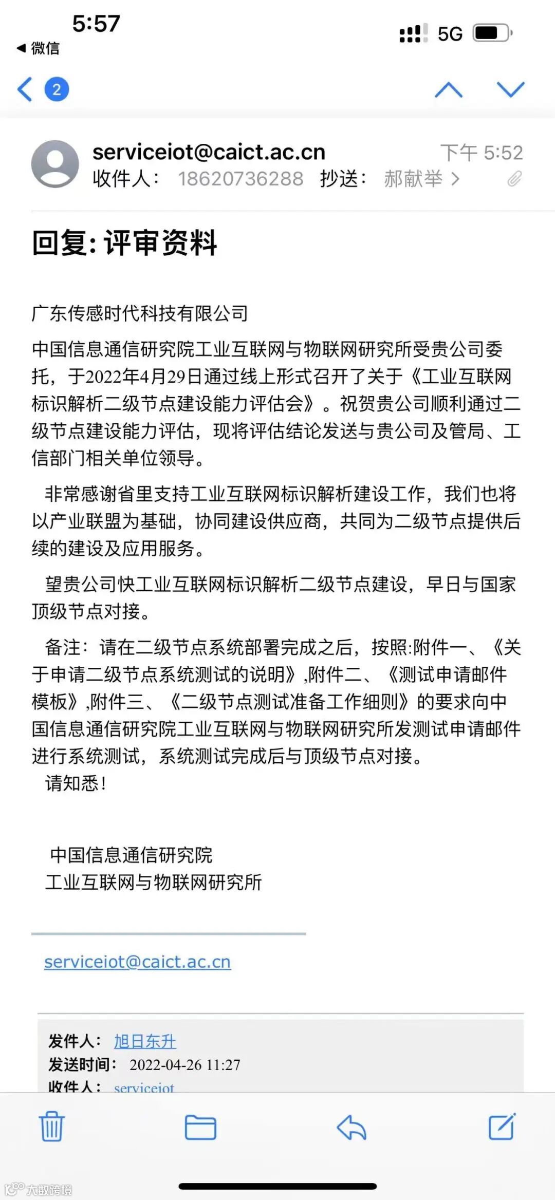 2022年4月29日,我会常务副会长袁正创办的广东传感时代科技有限公司通过中国信息通信研究院工业互联网与物联网研究所组织的《工业互联网标识解析二级节点建设能力评估会》,顺利获得国家工业互联网二级节点建设资格!