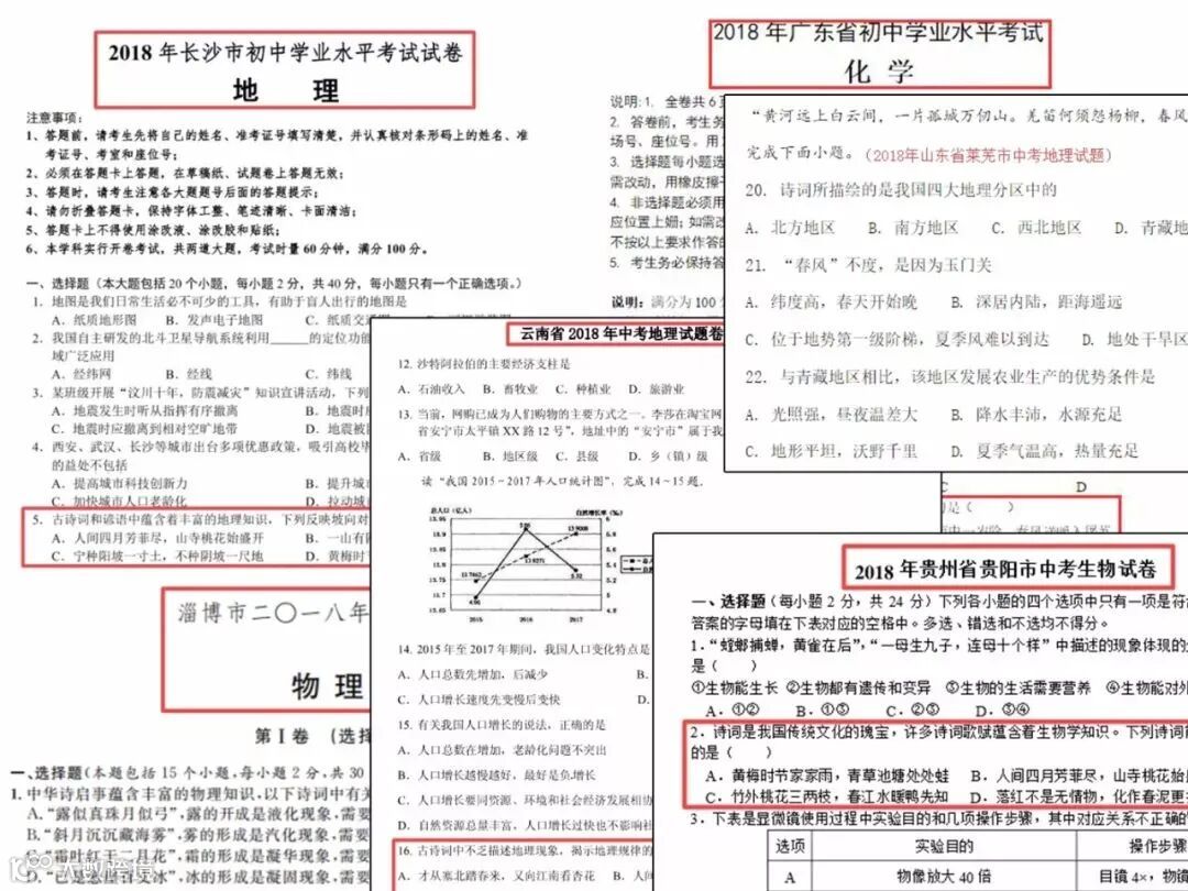 下图就是各地中考试卷中出现的与诗词有关的理科试题,这里只列举很小的一部分,几乎每个省份的中考试卷中都出现过这种题目。