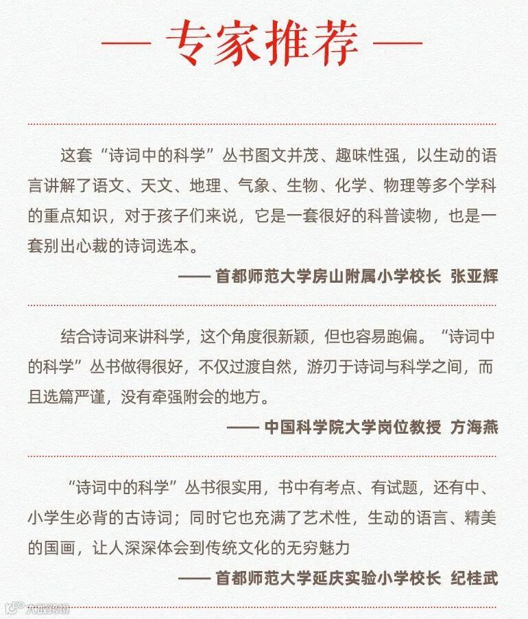 作为教育部推荐的必读书目,经由多位资深名师的精心打磨,和众多专家推荐,这套《诗词中的科学》的专业和权威可想而知,完全可以作为教材让孩子阅读。