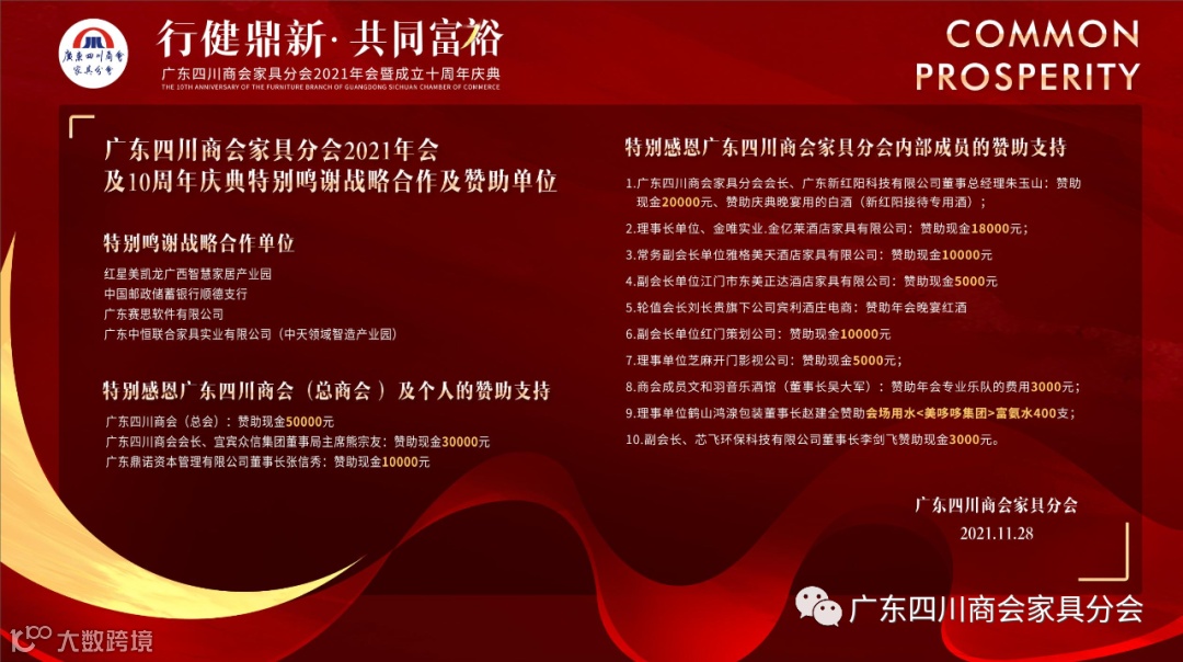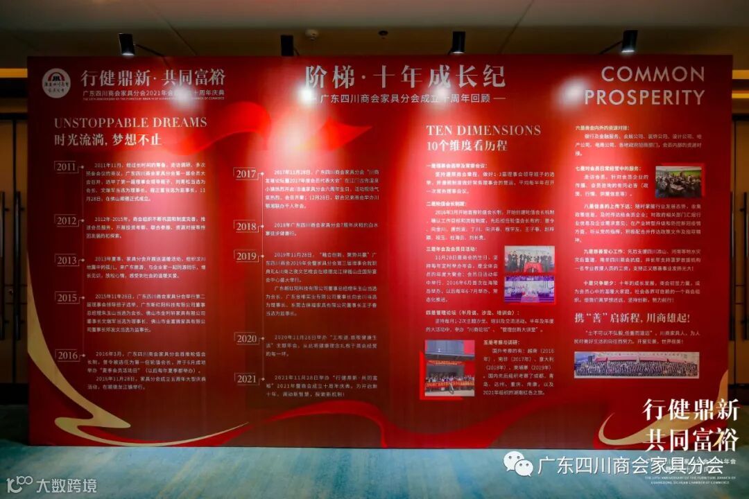 十年磨剑开征途,今朝扬帆济沧海。11月28日,广东四川商会家具分会2021年会暨成立十周年庆典在顺德龙江联塑万怡酒店成功举办。“行健鼎新,共同富裕”是本次庆典活动的主题。
