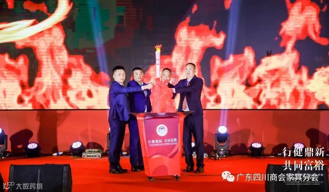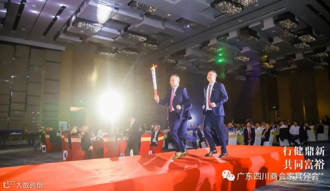 首先播放了商会宣传片、薪火相传的接力宣传片,伴随着激昂的乐曲,广东四川商会家具分会会长朱玉山高举“火炬”,与理事长向金川、监事会代表曾令一道,激情入场,广东四川商会(总会)会长熊宗友发出号令“广东四川商会家具分会 新十年、新征程启动”,在全场与会人员的见证下,朱玉山会长点燃舞台主“火”炬,开启了广东四川商会家具分会新十年的发展征程!