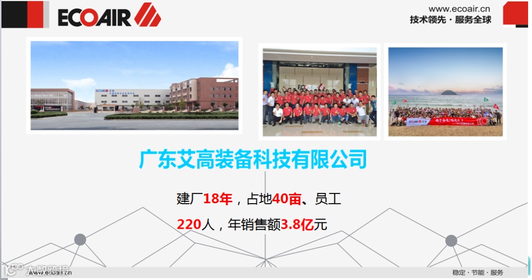 广东艾高装备科技有限公司是集空压机研发、制造、销售、服务于一体的集团化空压机系统服务提供商,主营永磁变频螺杆空压机、低压空压机、两级压缩空压机、无油涡旋机、无油螺杆鼓风机、无油离心机、真空泵等空压机设备。总部位于粤港澳大湾区核心腹地广东佛 山,占地40亩,交通便利,位置优越。